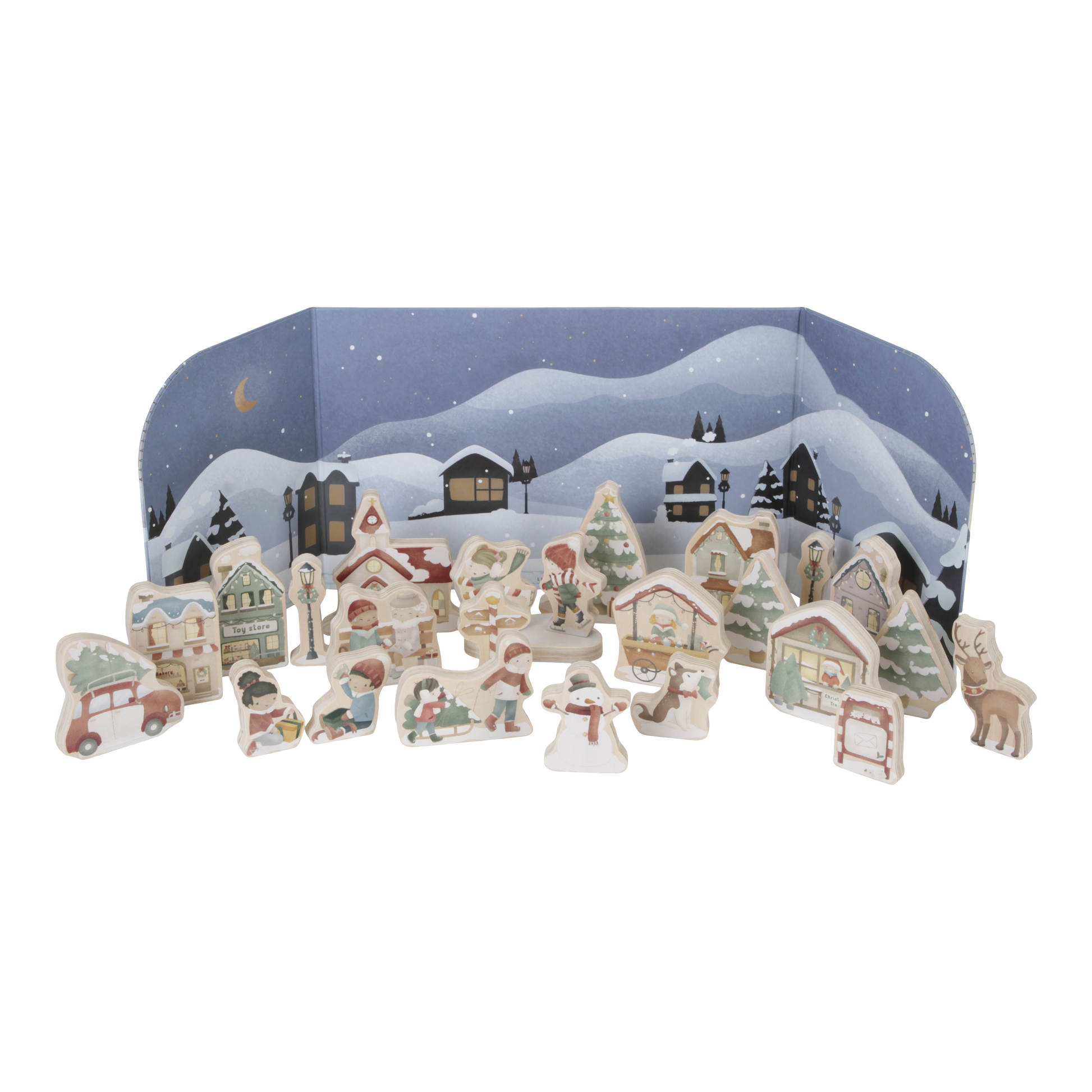 Le compte à rebours jusqu'à Noël n’a encore jamais été aussi amusant ! En décembre, ouvre chaque jour un cadeau du calendrier de l'Avent pour construire ton propre village de Noël à l'approche des fêtes. La boîte de rangement contient un fond en carton solide avec des illustrations hivernales et 24 petits cadeaux contenant 25 figurines en bois. Viens faire du patinage sur la place, achète ton sapin à la crèche et traverse le village en traineau. Après 24 jours, les fêtes de Noël sont enfin terminées !