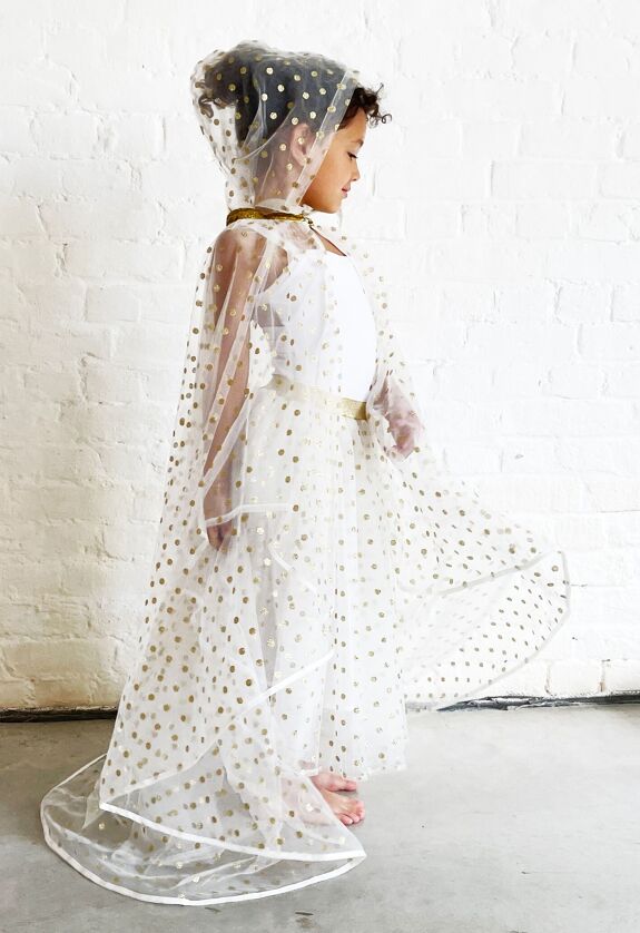 La cape de déguisement couleur crème à pois doré avec capuche.