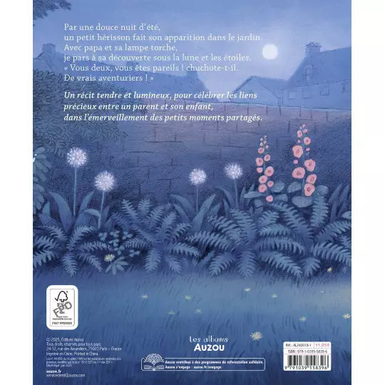 Par une douce nuit d’été, un petit hérisson fait son apparition dans le jardin. Avec papa et sa lampe torche, je pars à sa découverte sous la lune et les étoiles. « Vous deux, vous êtes pareils ! chuchote-t-il. De vrais aventuriers ! »