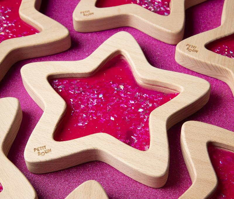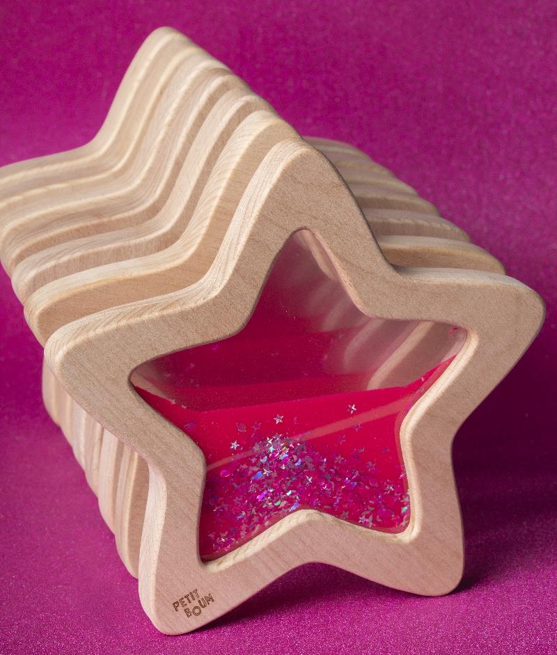 Avec un cadre en bois de hêtre idéal pour les mains des plus petits. Les étoiles sont remplies de liquides colorés, paillettes et fluides fluorescents qui brillent dans le noir et stimulent l'imagination à chaque fois que vous les secouez.
