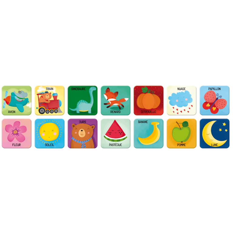 Livre de 10 pages et 28 cartes mémo pour développer la motricité fine, stimuler l'apprendissage et favoriser la concentration. Reconnais les images et apprends les mots en jouant !