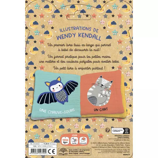 Un premier imagier de la nuit sous la forme d’un petit livre tissu en lange tout doux. Le petit format permet une prise en main idéale pour bébé. Le lange est une matière toute douce contre laquelle il peut se frotter !