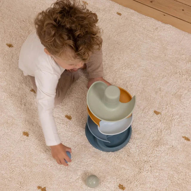 Laissez la balle rouler! La tour en spirale de Little Dutch assure un plaisir de jeu sans fin. Cet ensemble coloré se compose de 5 pièces subtilement colorées. Laissez les boules tomber une par une sur la couche supérieure et voyez comment elles roulent et tombent l'une après l'autre. La tour en spirale contribue au développement de la coordination œil-main et permet d'apprendre aux petits la relation de cause à effet.