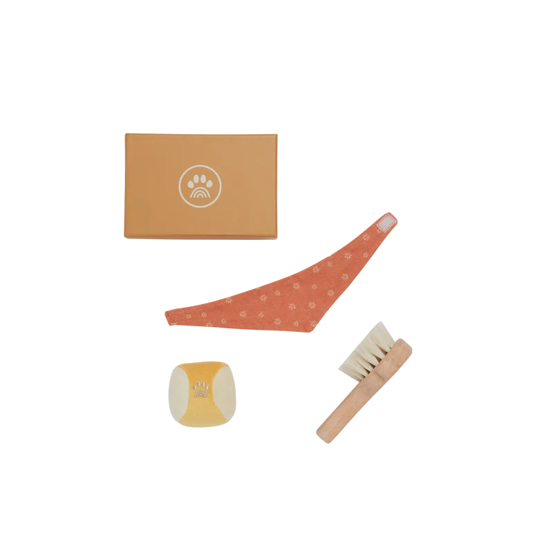 - Le kit de démarrage comprend une balle en peluche magnétique, un bandana en coton et une brosse en bois