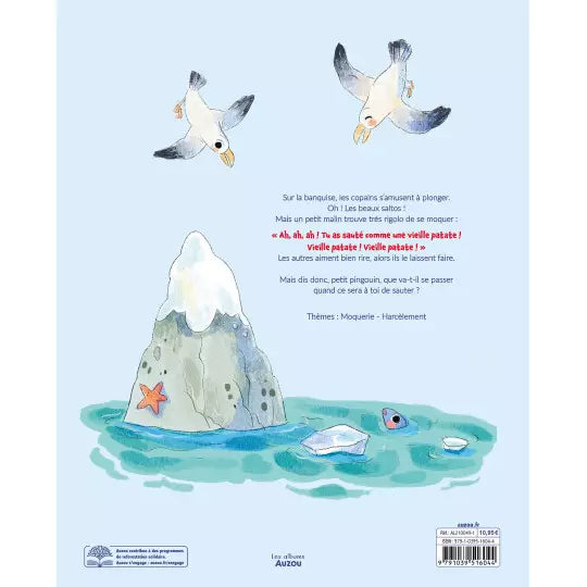 Un concours de plongeon s'organise sur la banquise. Tous les animaux sautent les uns après les autres, en faisant de magnifiques pirouettes ! Mais Malouin le pingouin n'arrête pas de se moquer et de les appeler "vieille patate". Ça suffit, maintenant !