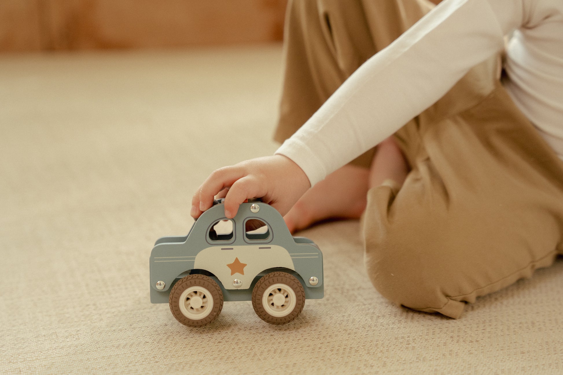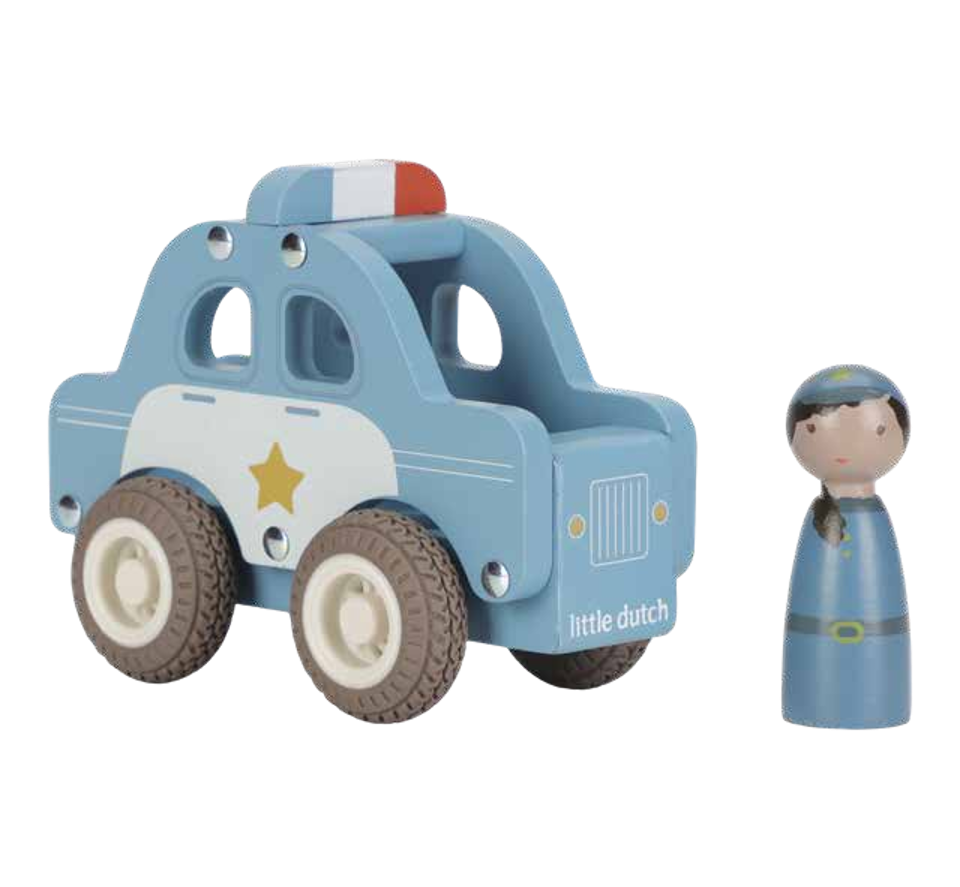 Intervention rapide ! Cette voiture de police en bois se déplace facilement grâce à ses roues en caoutchouc. Accompagnée d’un policier déterminé, elle est prête à maintenir la sécurité dans la ville.